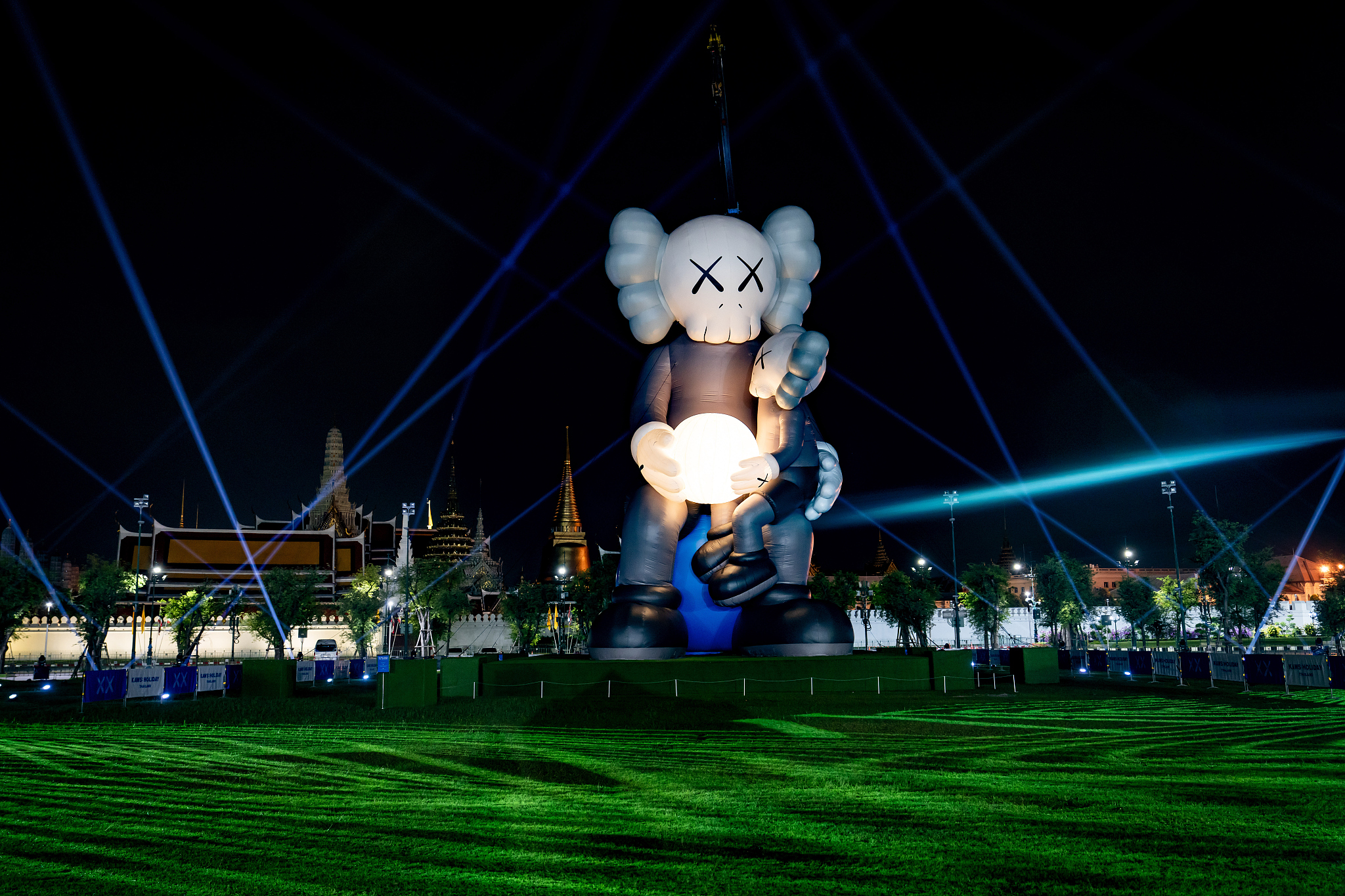 当地时间2025年5月16日,泰国曼谷,艺术家KAWS创作的18米高雕塑《伙伴》在大皇宫的圣兰广场进行日出前的排练(图片来源:视觉中国)